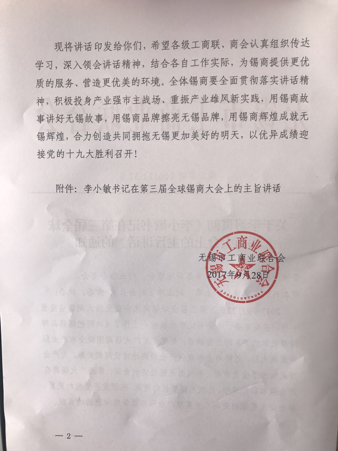 各位锡商,各位来宾,各位朋友,无锡的经济有今天的成就和地位,是历代锡商团结奋斗的结果,无锡产业强市美好的明天,仍需当代锡商继续努力,让我们携起手来,秉持“敢创人先、坚韧刚毅、崇德厚生、实业报国”的锡商精神,发扬“专心专注、至精至善、创新创造、行稳行远”的无锡工匠精神,传承工商基因,汇聚锡商力量,用锡商故事讲好无锡故事,用锡商品牌擦亮无锡品牌,用锡商辉煌成就无锡辉煌,合力创造、共同拥抱无锡更加美好的明天。